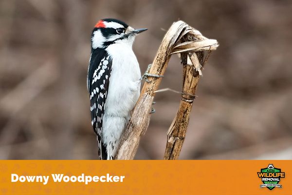 Downy Woodpeckers are the smallest type of woodpecker in North America. It is a small bird, with a length of around 6 inches. The back and wings are black, with white stripes running down the sides. The underparts are white, with a black band across the breast. The head is black, with a white patch on the back.
