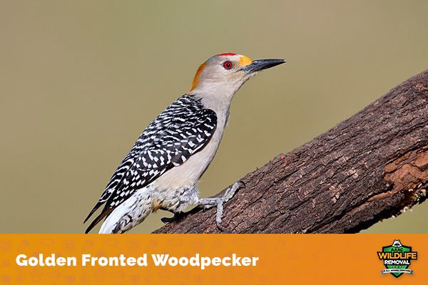 The Golden Fronted Woodpecker is a common type of woodpecker in North America. It is a small bird, with a length of around 10 inches. The back and wings are black, with white stripes running down the sides. Its belly is pale yellow, and the head is black with a red crest.